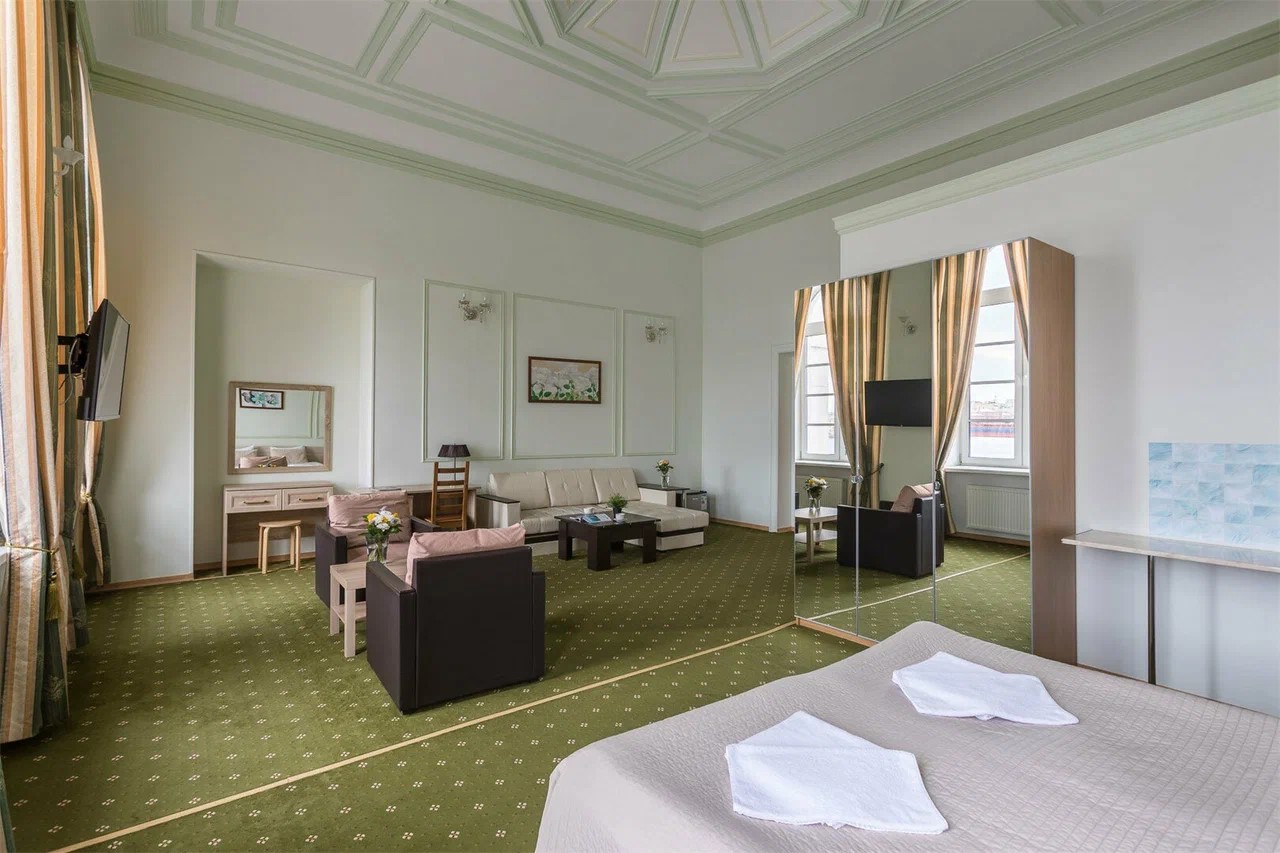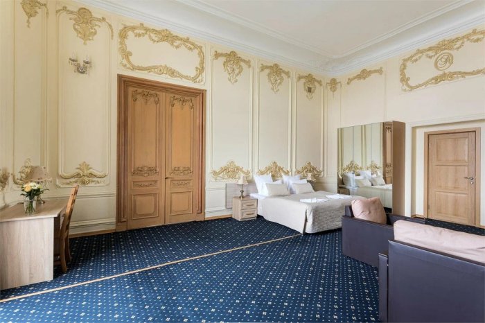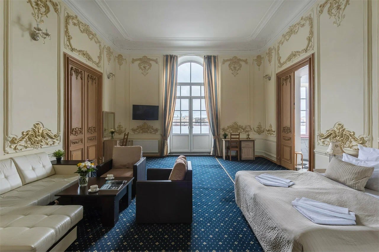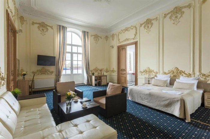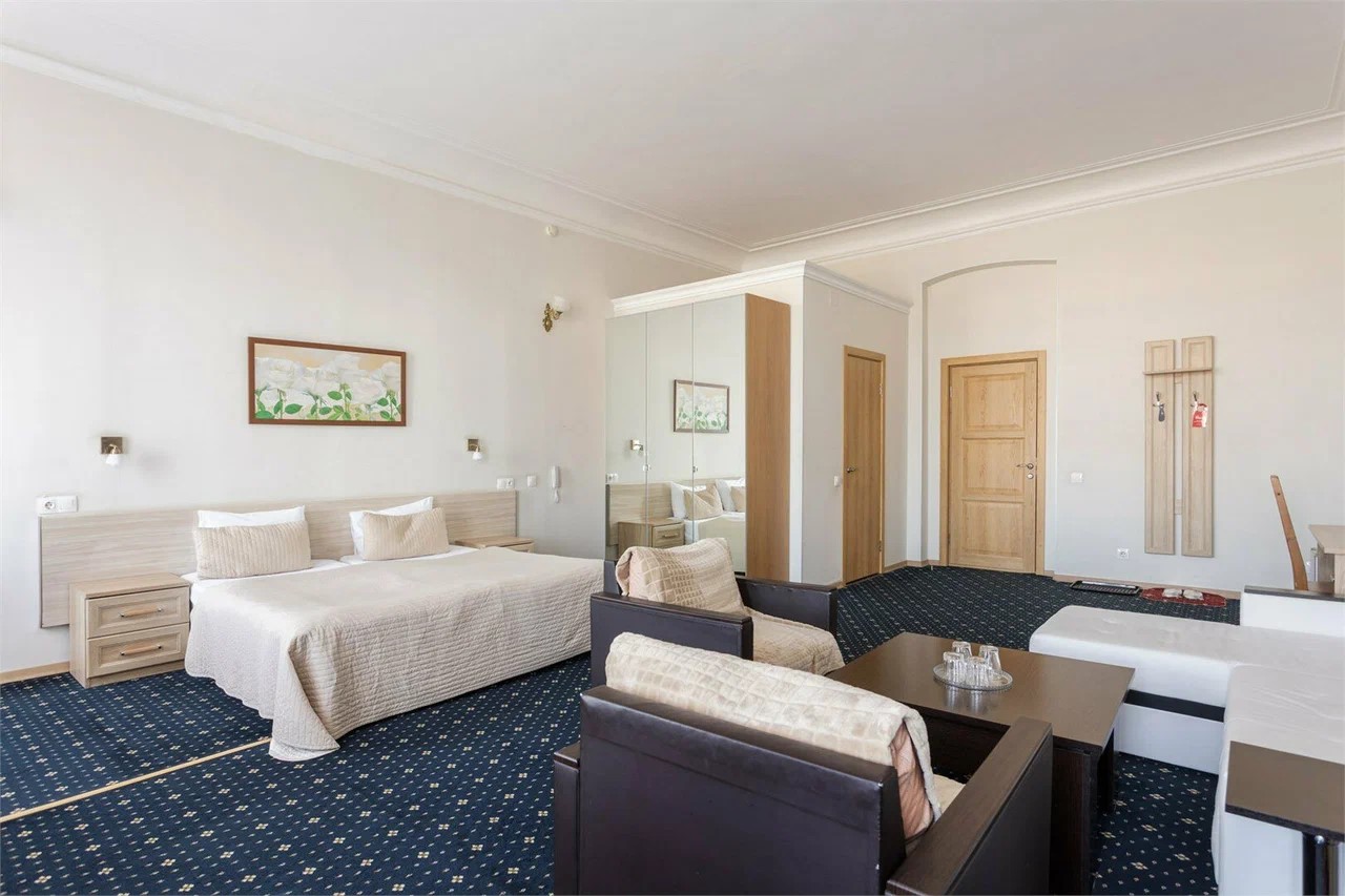 В роскошном номере люкс повышенной комфортности с видом на Английскую набережную установлены 2 кровати (составлены вместе), прикроватные тумбочки, холодильник, раскладной диван, журнальный стол, стулья, шкаф для одежды, зеркало, телевизор, стаканы, фен, халаты, тапочки.