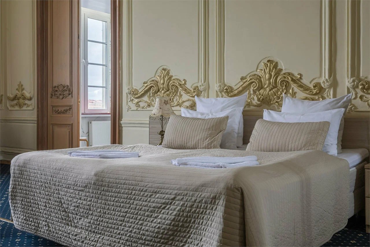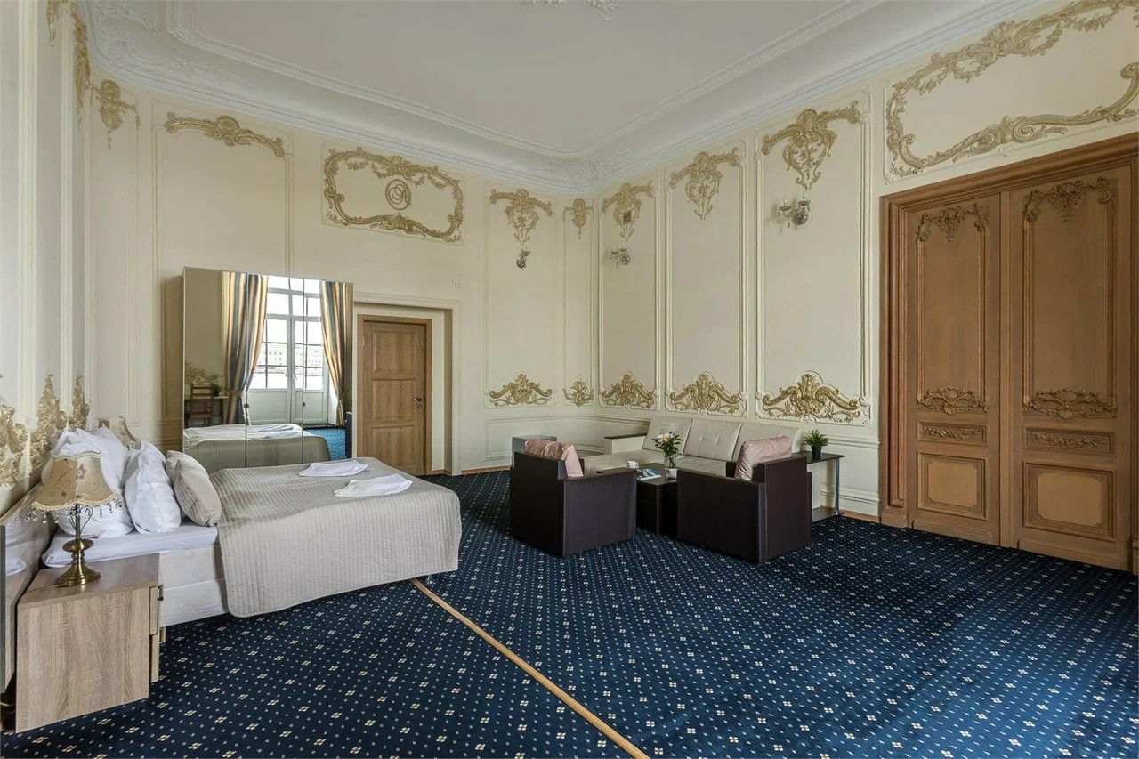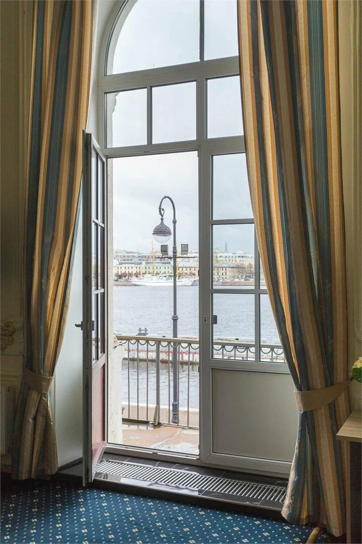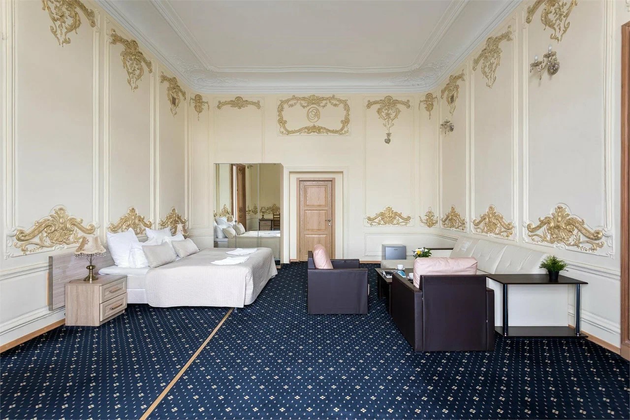 В роскошном номере люкс повышенной комфортности с видом на Английскую набережную установлены 2 кровати (составлены вместе), прикроватные тумбочки, холодильник, раскладной диван, журнальный стол, стулья, шкаф для одежды, зеркало, телевизор, стаканы, фен, халаты, тапочки.
