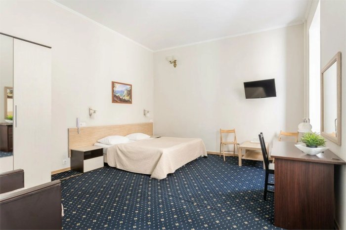Стандартный двухместный номер с одной двуспальной кроватью. В номере прикроватные тумбочки, журнальный столик, стулья, шкаф для одежды, телевизор.
