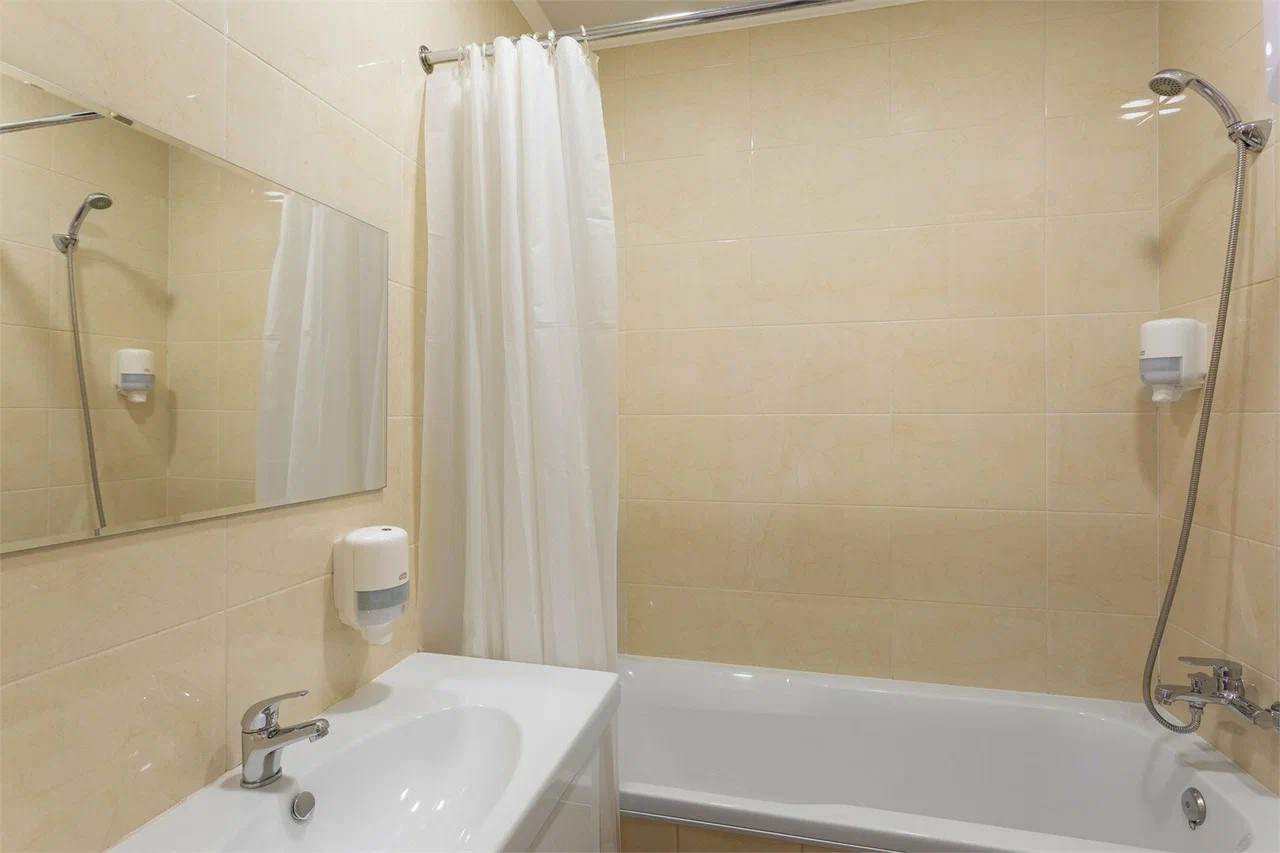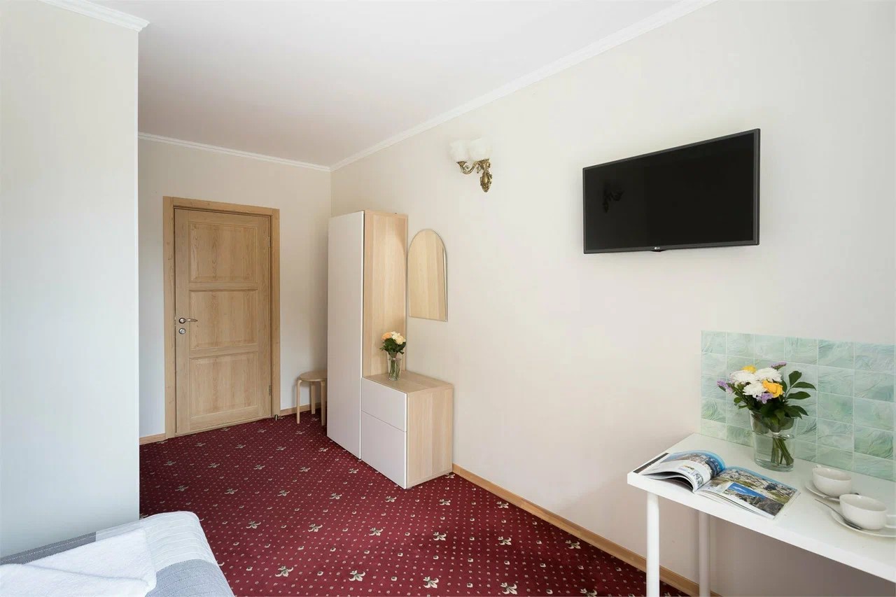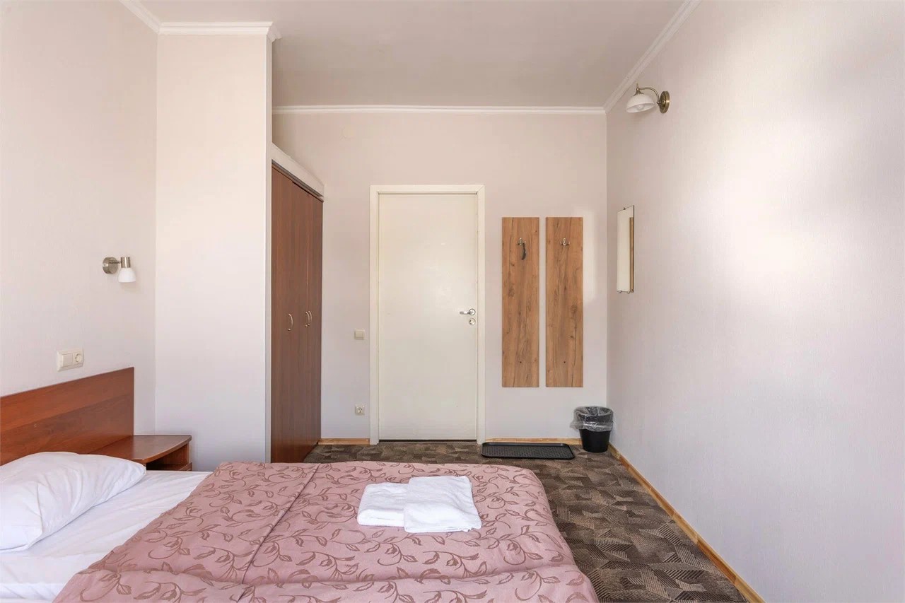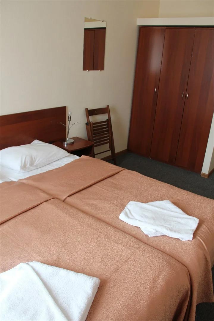 Двухместный номер сраздельными кроватями (составлены вместе) со своими удобствами (душ и туалет в номере). В номере также имеется телевизор, шкаф для одежды.