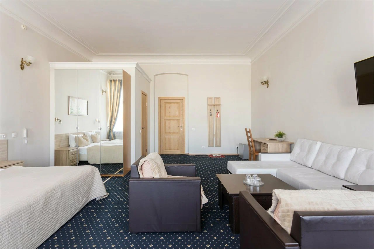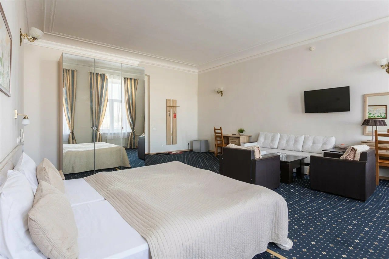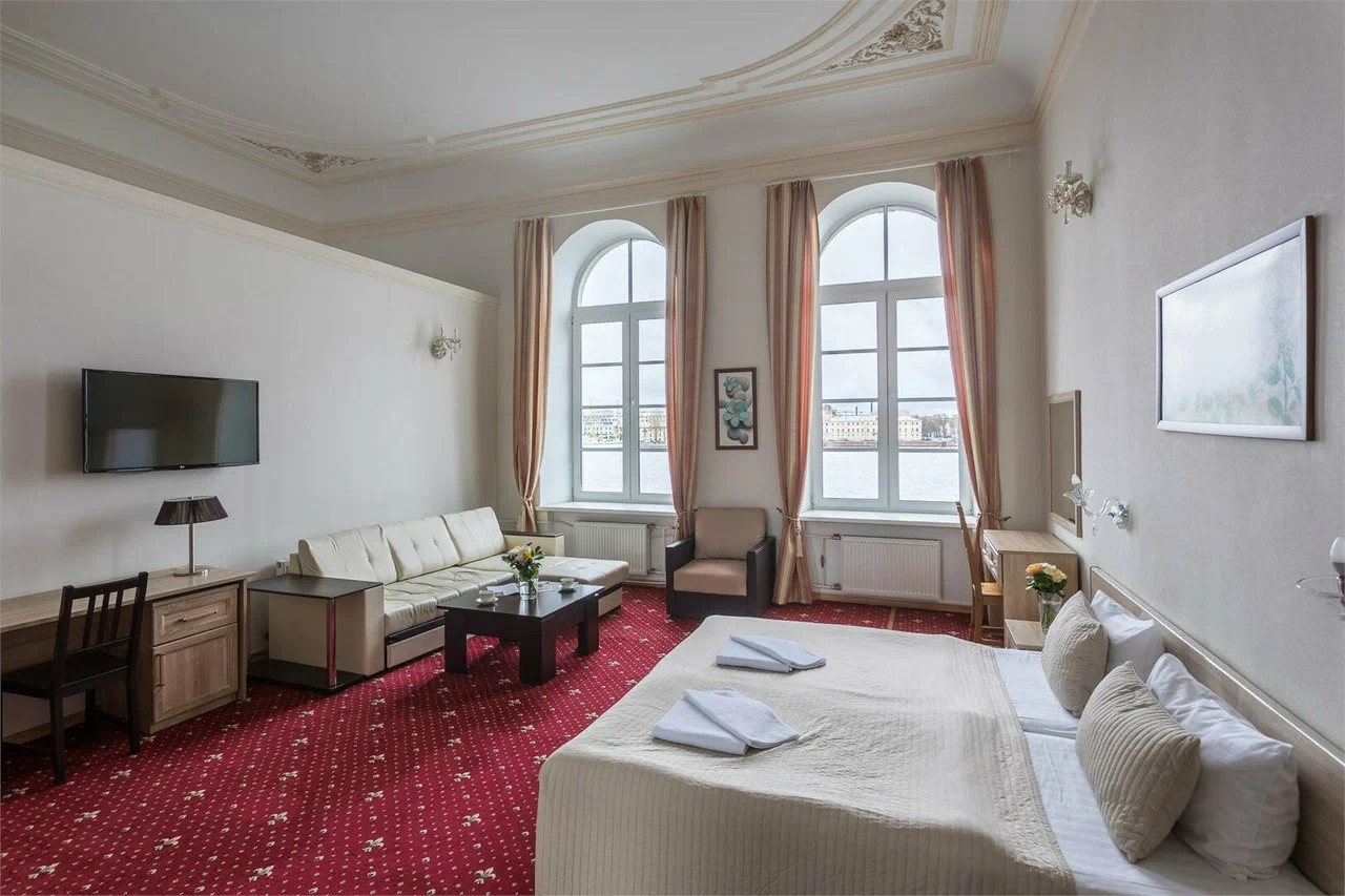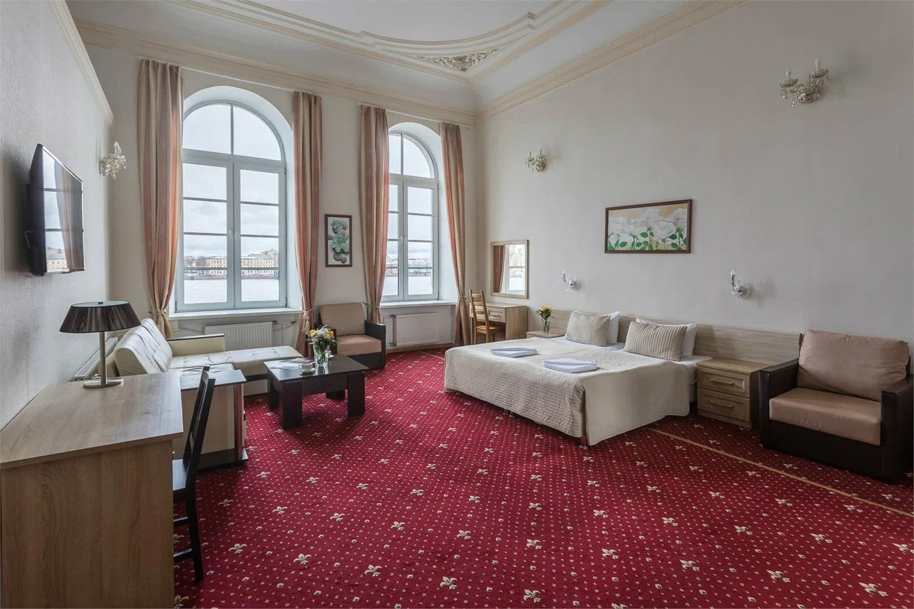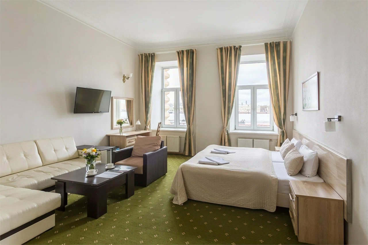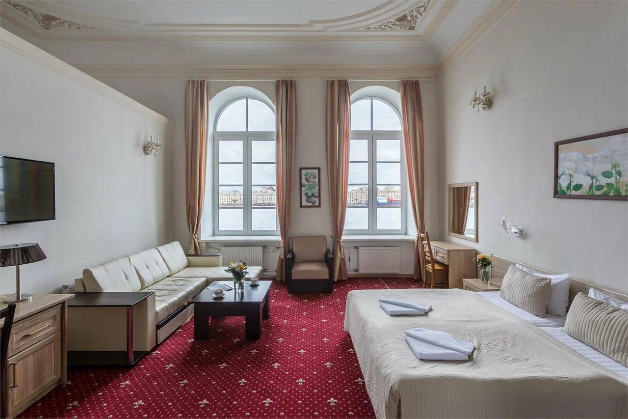 Комфортные номера с видом на Английскую набережную. В номерах установлены 2 кровати, составленные вместе, раскладной диван, прикроватные тумбочки, холодильник, журнальный столик, стулья, телевизор, шкаф для одежды, зеркало, стканы, фен, халаты, тапочки.