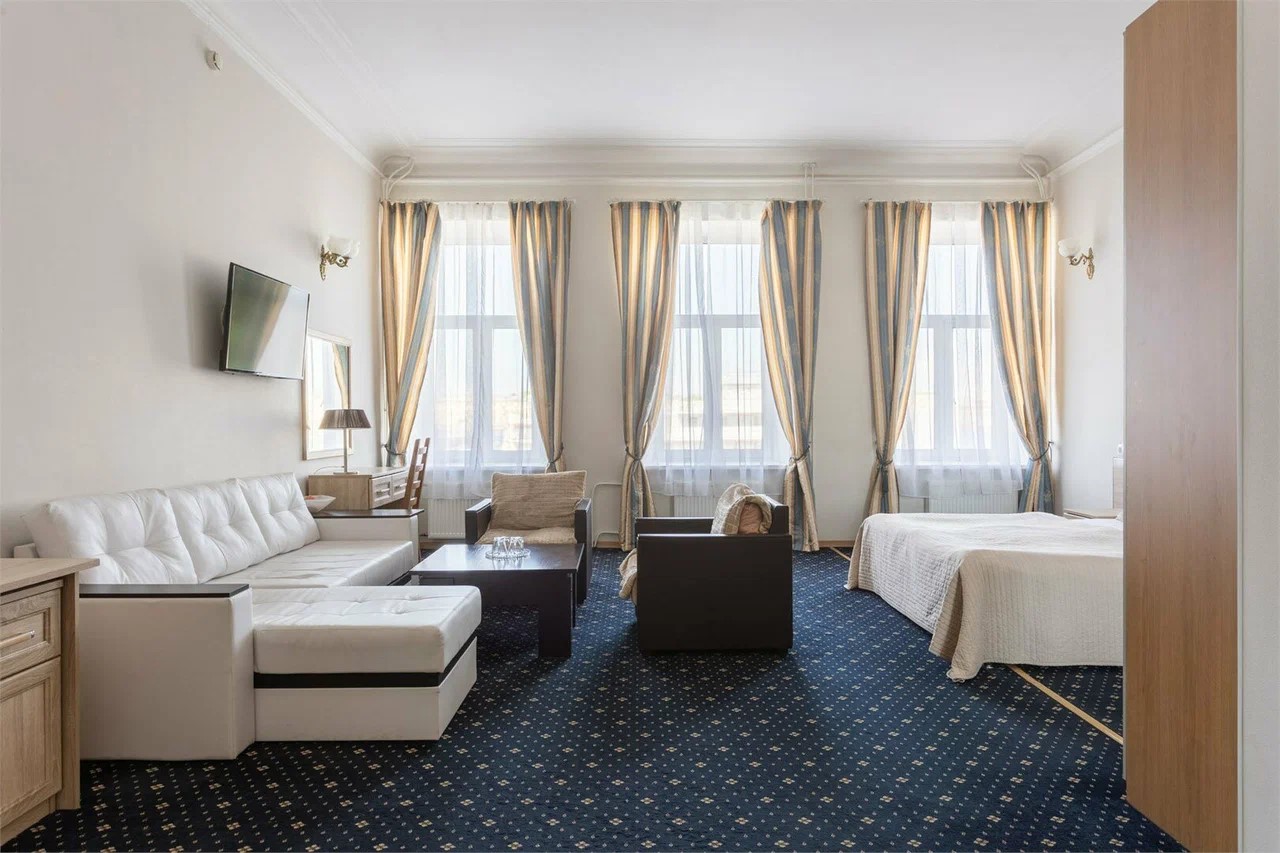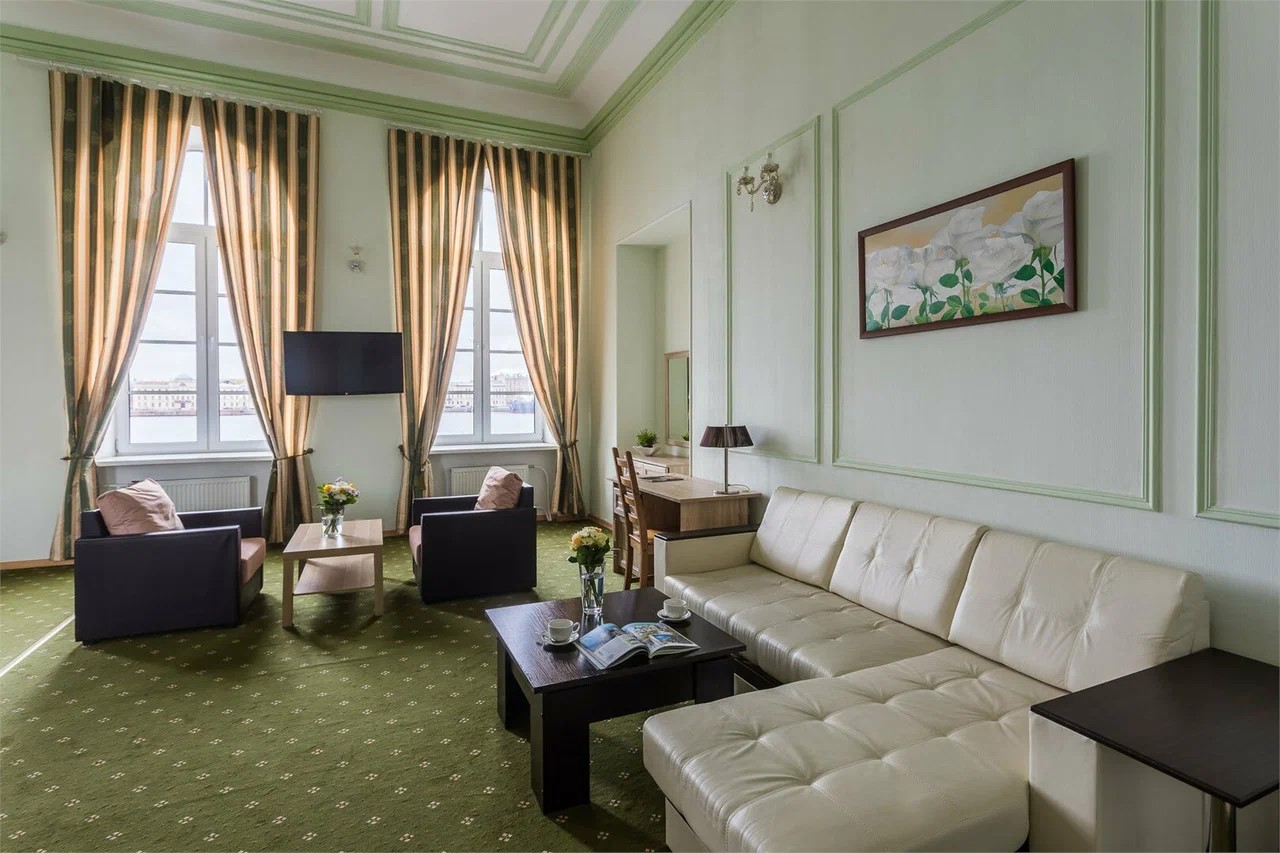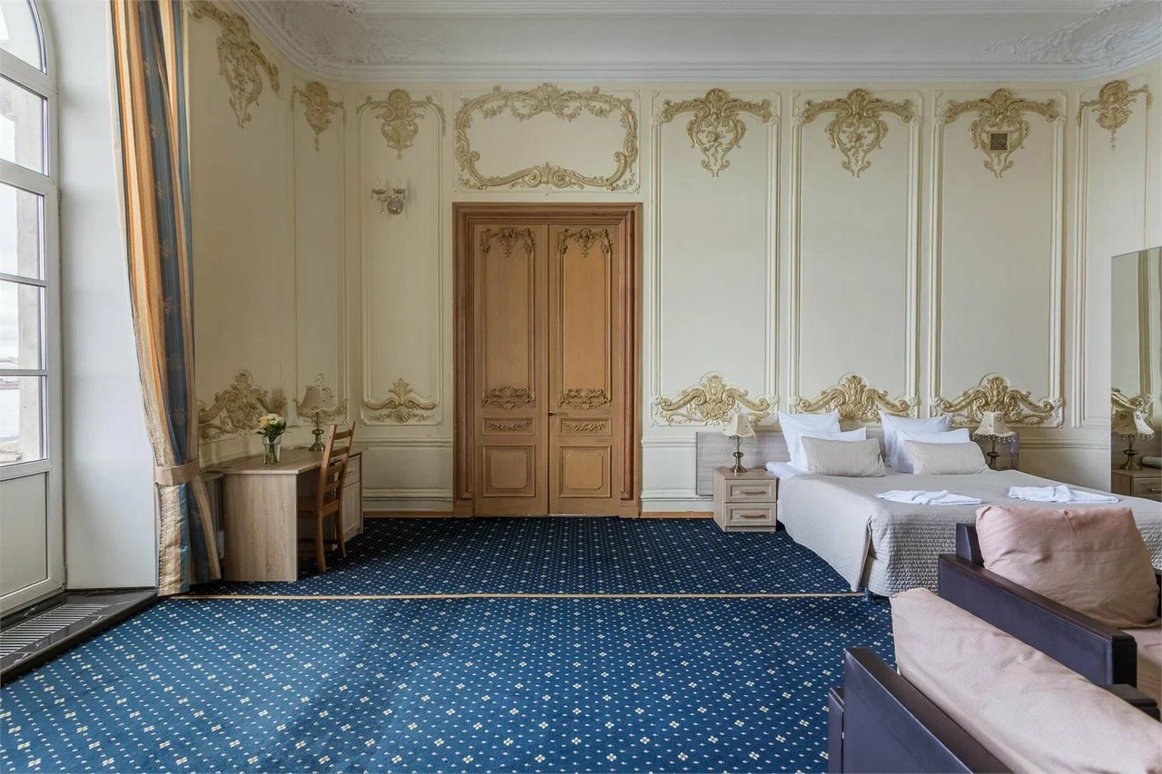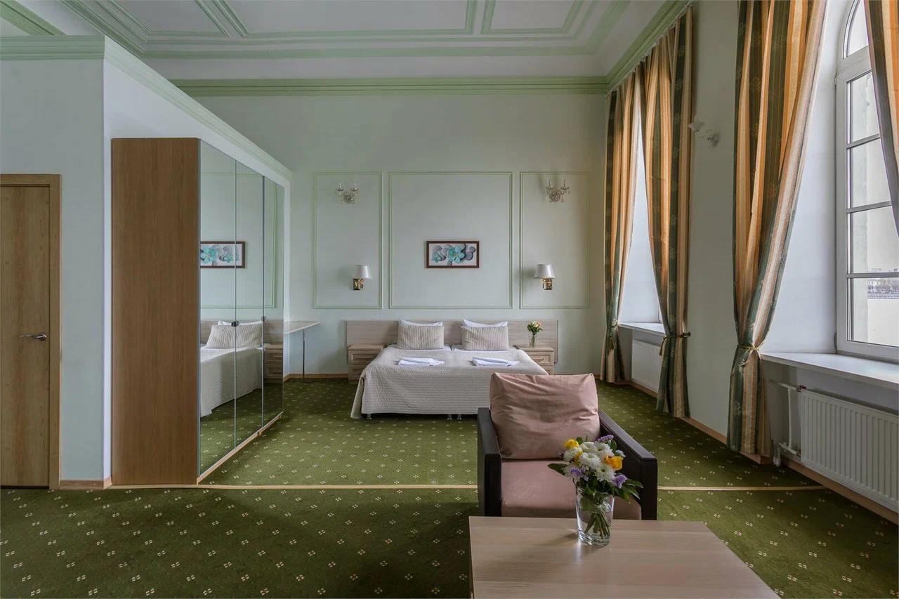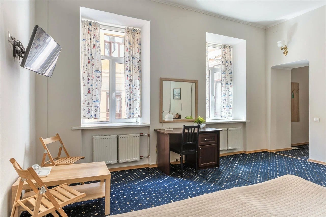 Комфортные номера с видом на Английскую набережную. В номерах установлены 2 кровати, составленные вместе, раскладной диван, прикроватные тумбочки, холодильник, журнальный столик, стулья, телевизор, шкаф для одежды, зеркало, стканы, фен, халаты, тапочки.