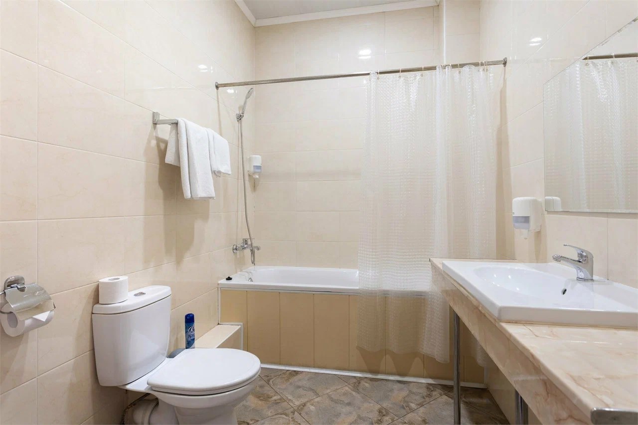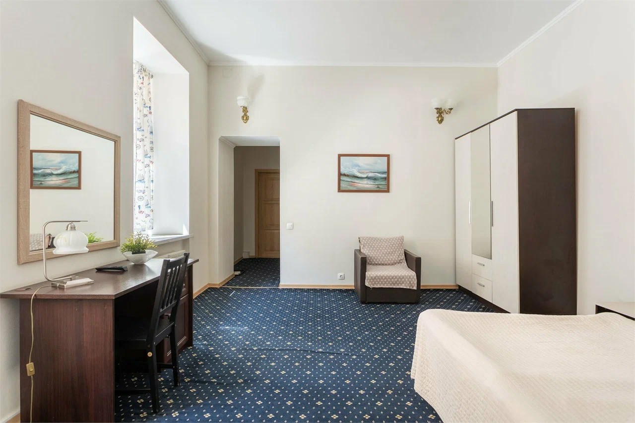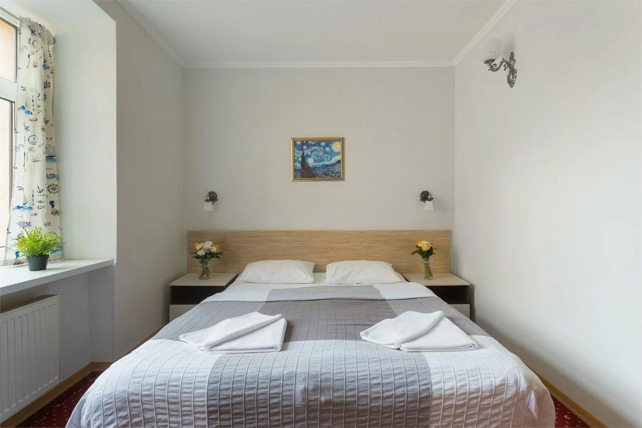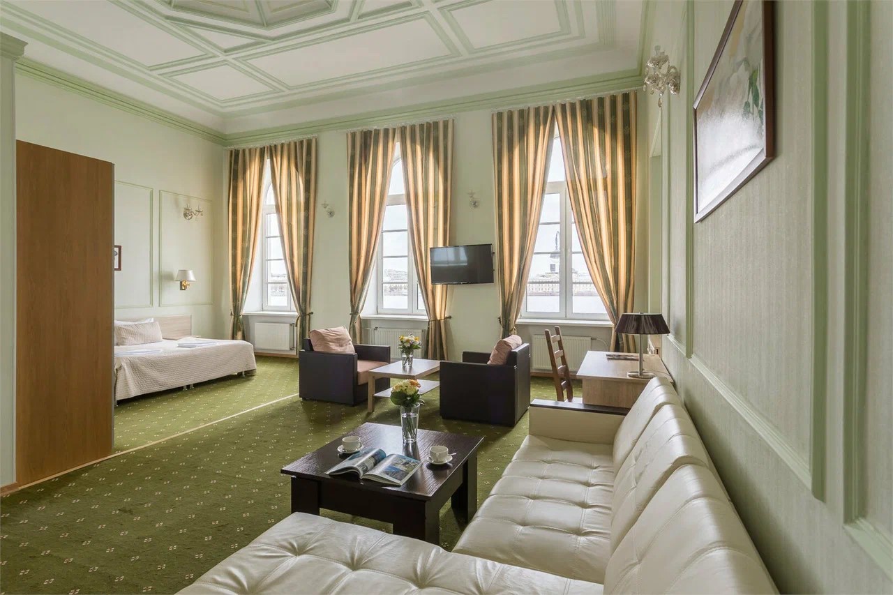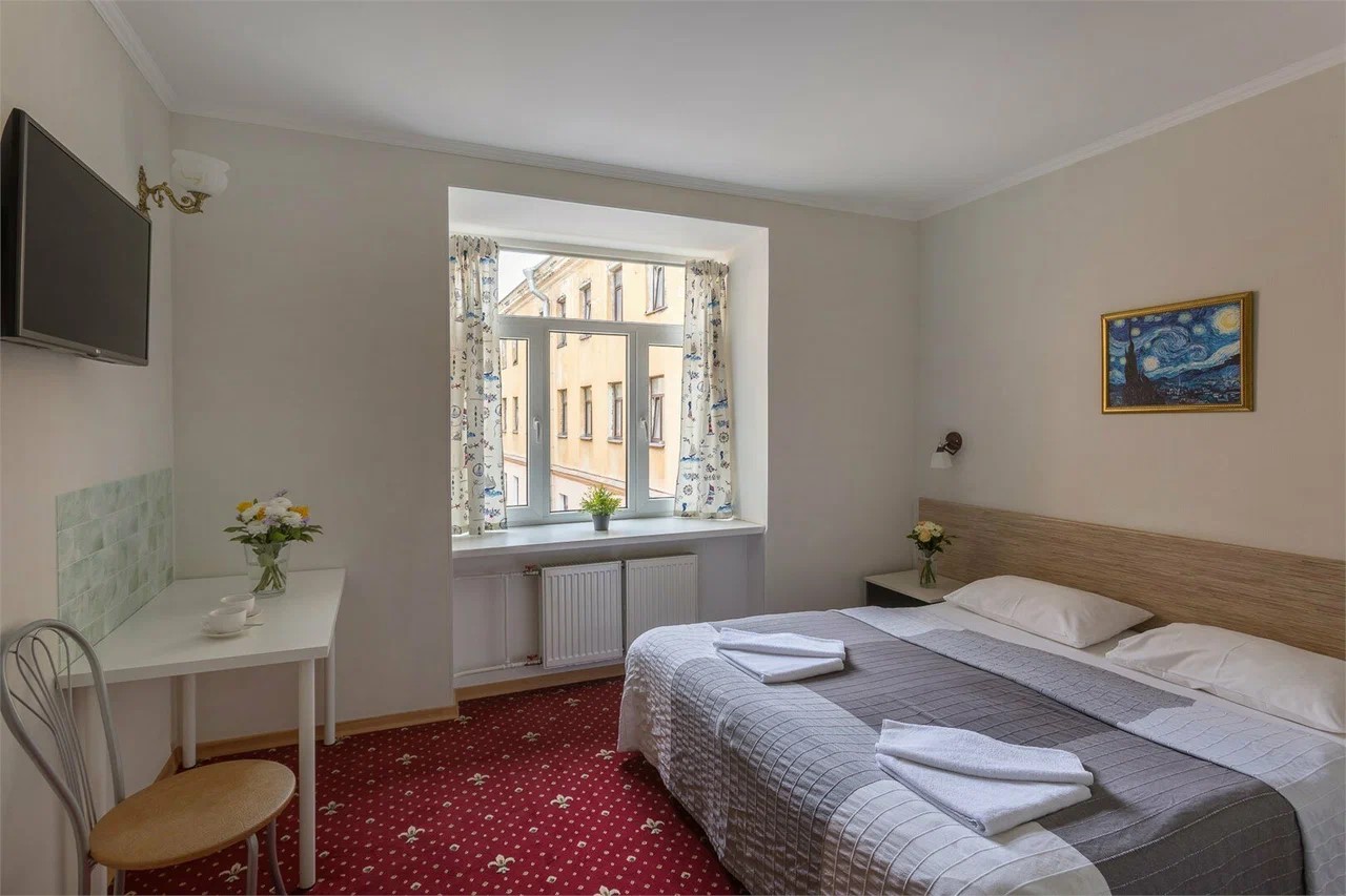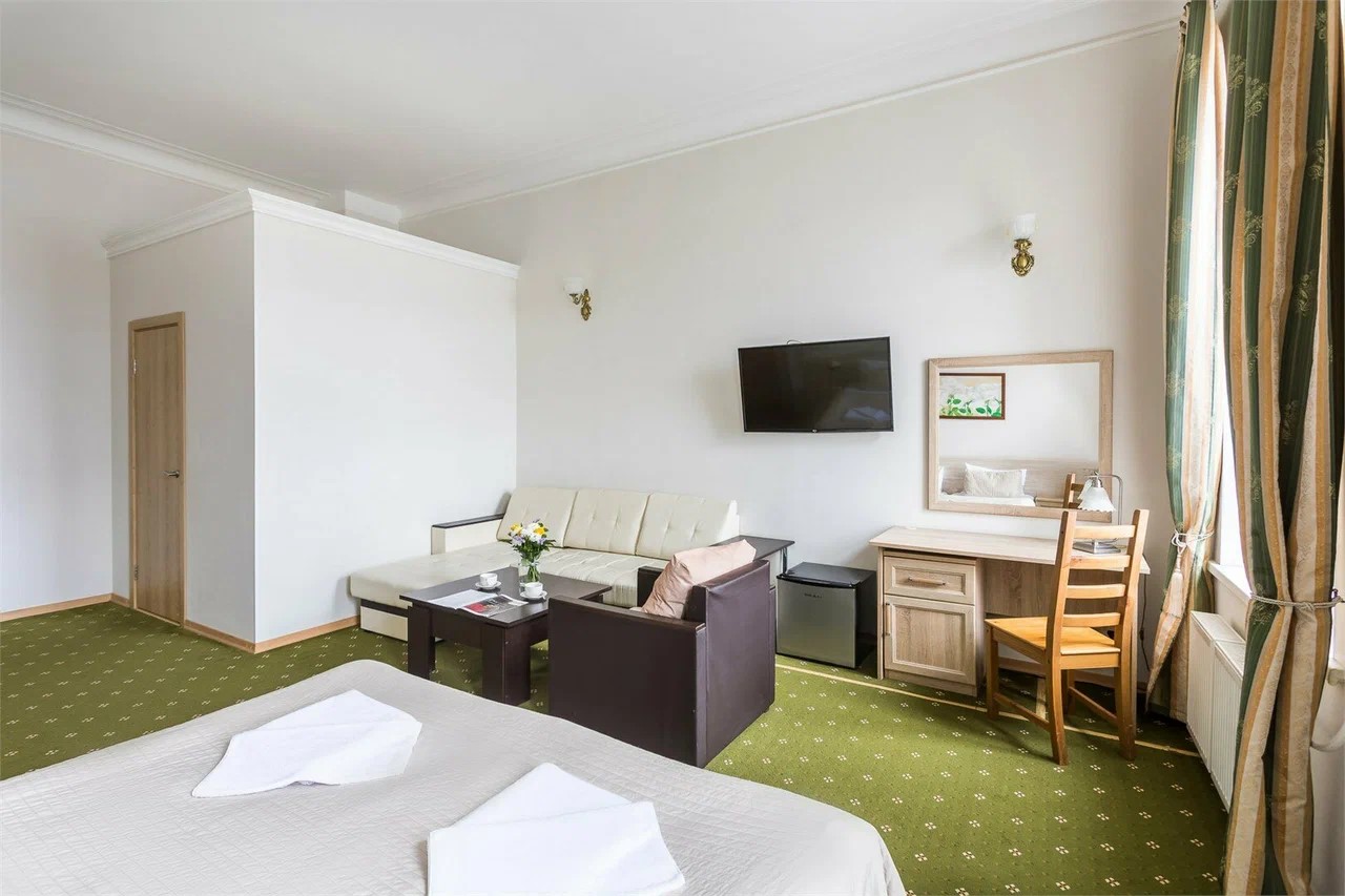 Комфортные номера с видом на Английскую набережную. В номерах установлены 2 кровати, составленные вместе, раскладной диван, прикроватные тумбочки, холодильник, журнальный столик, стулья, телевизор, шкаф для одежды, зеркало, стканы, фен, халаты, тапочки.