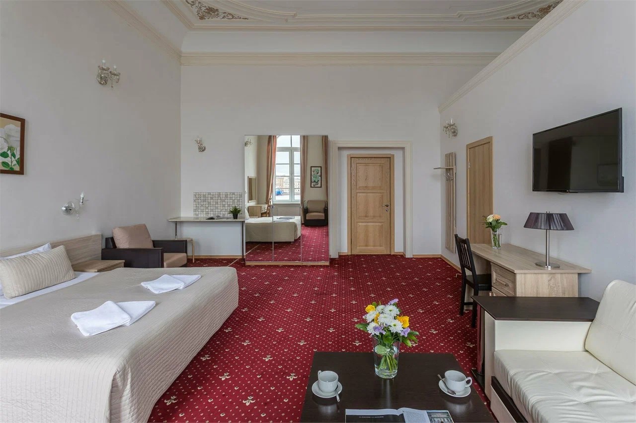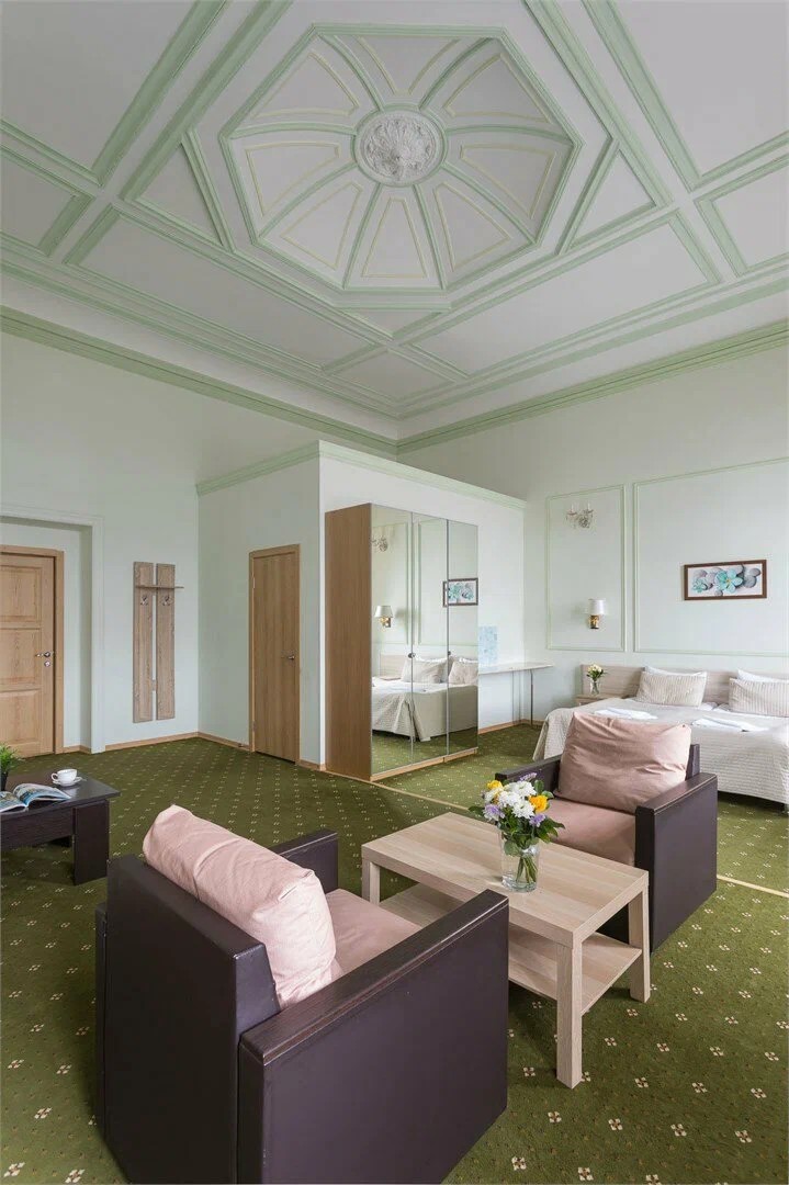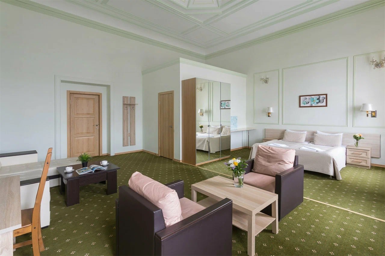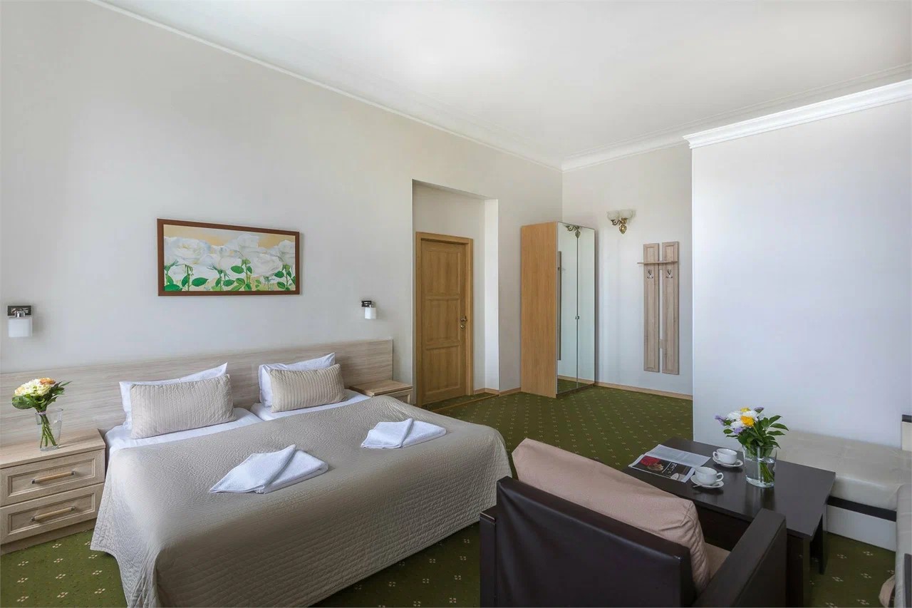 Номер категории люкс повышенной комфортности с балконом и видом на Английскую набережную. В номере установлены 2 кровати (составлены вместе), прикроватные тумбочки, раскладной диван, журнальный стол, холодильник, стулья, шкаф для одежды, зеркало, телевизор, стаканы, фен, халаты, тапочки.